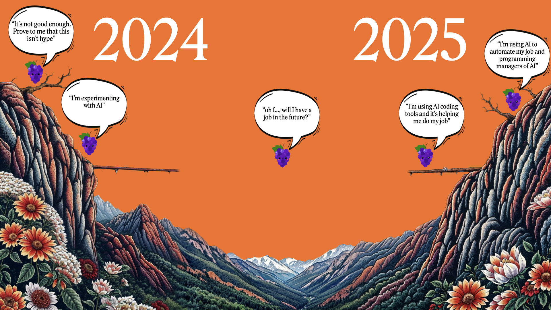 On the top left, we've got 'prove it to me, it's not real,' 'prove it to me, show me outcomes', 'prove it to me that it's not hype', and a bunch of 'it's not good enough' folks who get stuck up there on that left side of the cliff, completely ignoring that there are people on the other side of the cliff, completely automating their job function.
