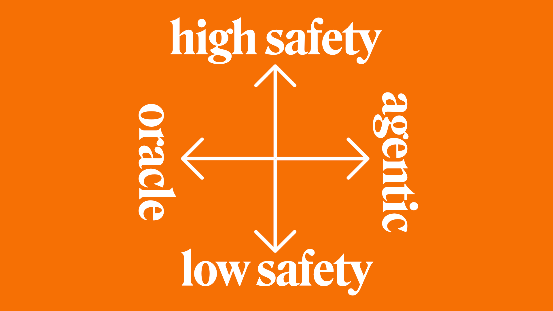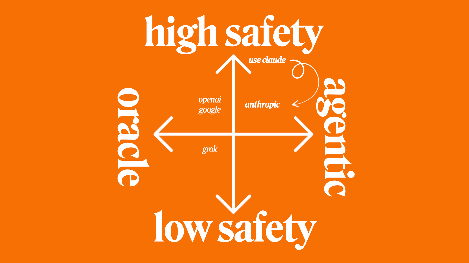 If you want something that's "ethics-aligned", it's Anthropic or OpenAI. So that's high safety. Similarly, you have oracles. Oracles are on the polar opposite of agentic. Oracles are suitable for summarisation tasks or require a high level of thinking.