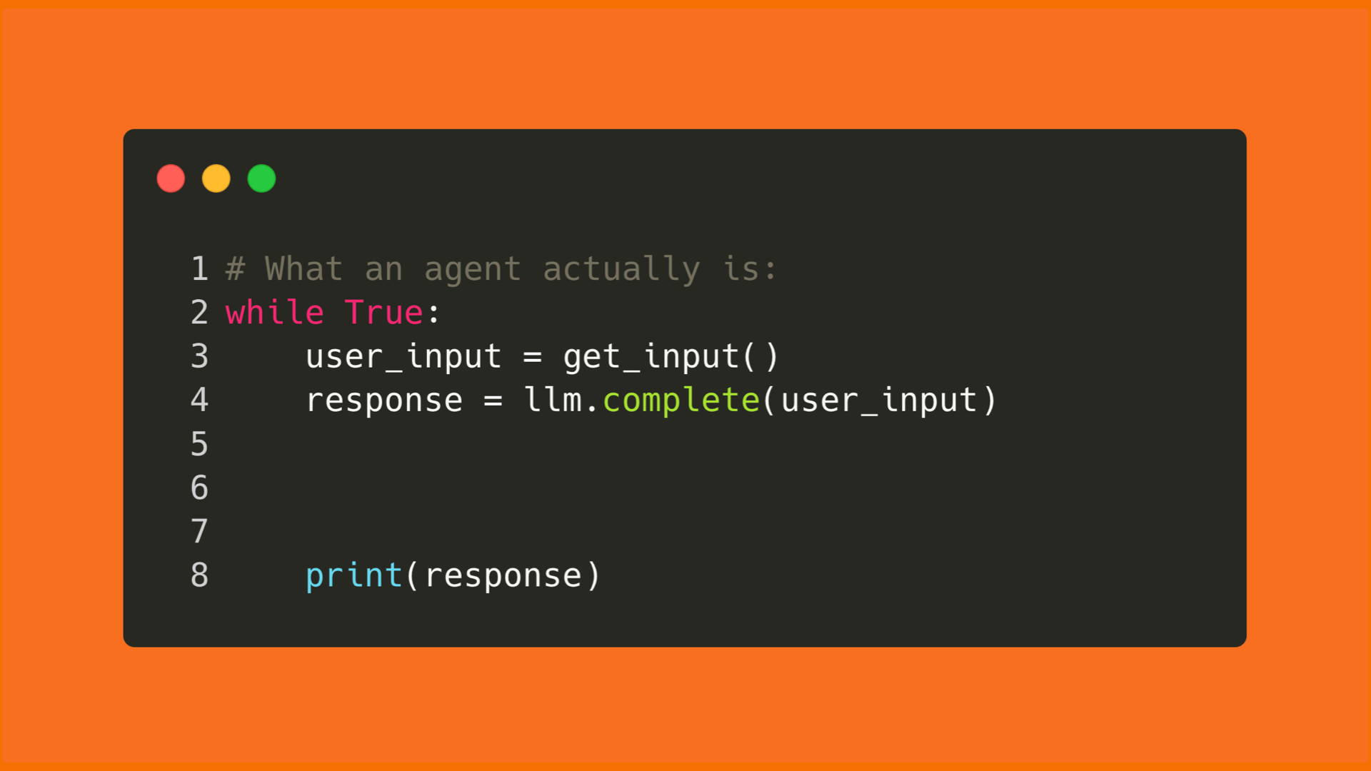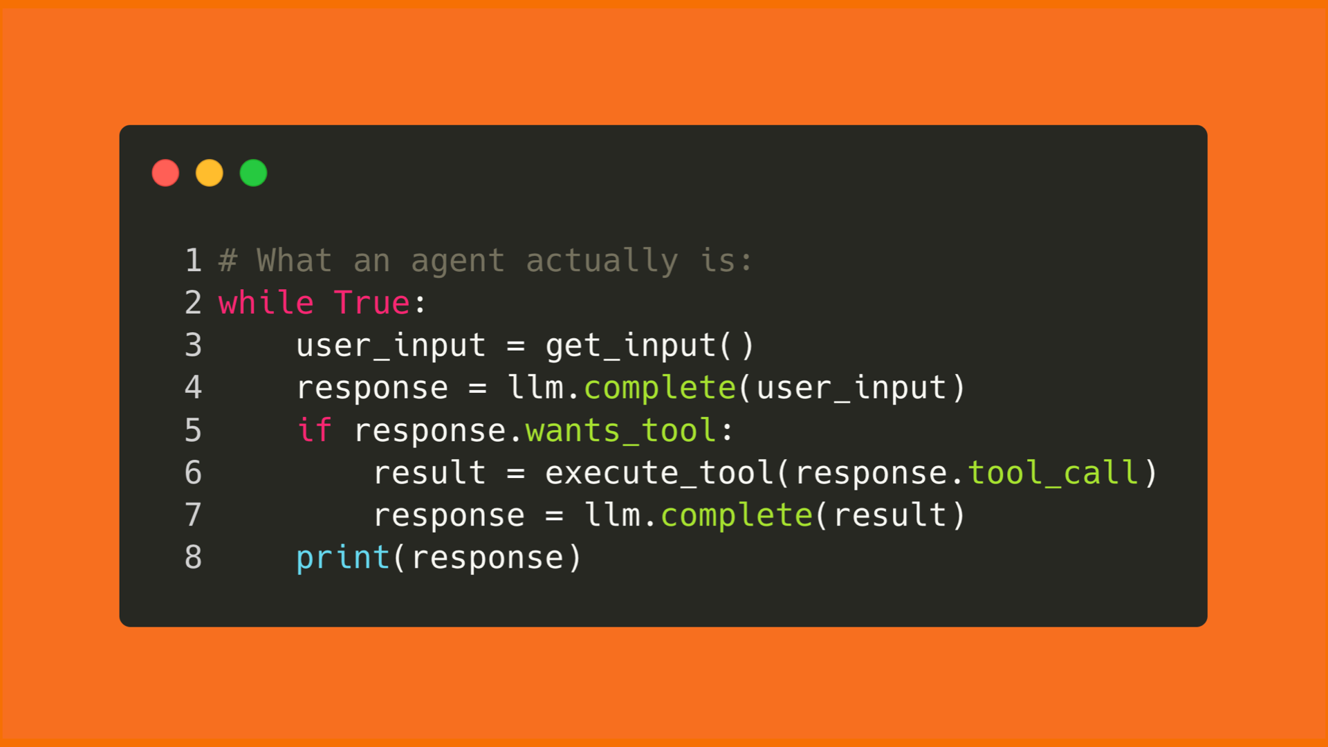 300 lines of code running in a loop with LLM tokens. You just keep throwing tokens at the loop, and then you've got yourself an agent.