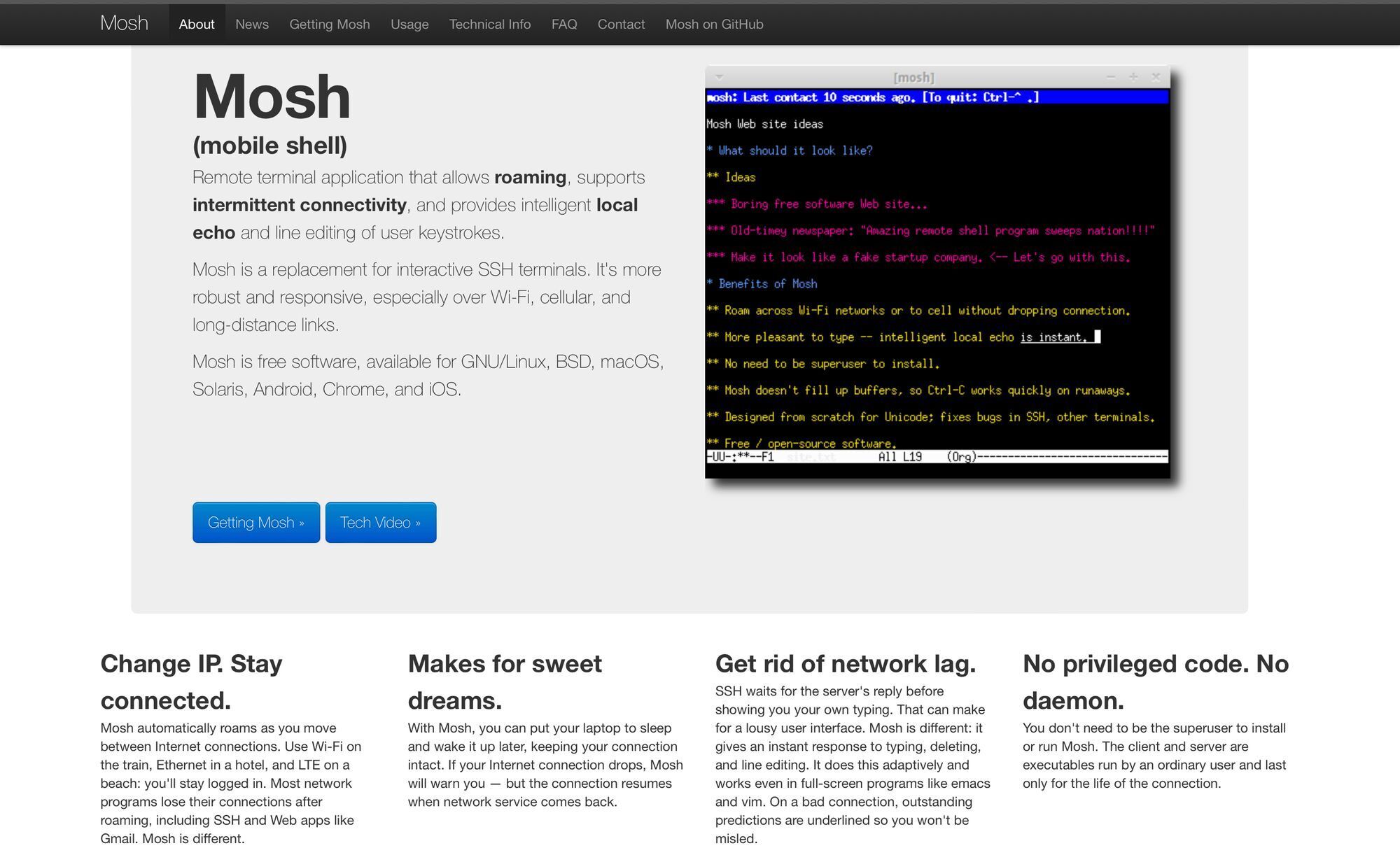 If you don't know about https://mosh.org then stop what you are doing right now, head to the homepage of the project and send regrets my way about how you wished you knew about this software sooner.