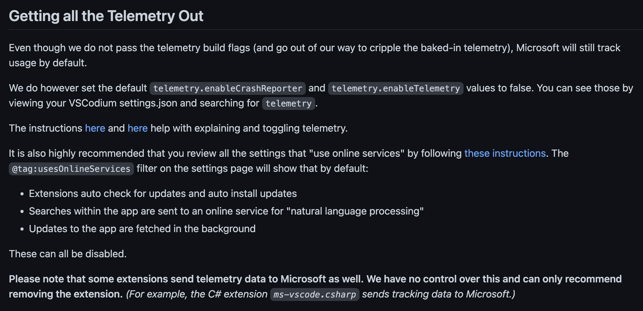 VSCodium does an extremely good job at disabling data collection, but due to not being licensed by Microsoft under the proprietary license VSCodium is not able to connect to the Microsoft Visual Studio Code Marketplace and suffers from the ecosystem fracture by design problem...