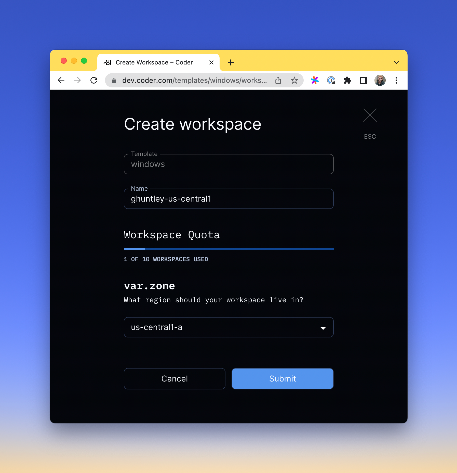Workspaces on Coder go beyond compute. There are over 2000+ Terraform providers in the world right now which can be wired in as a development environment dependency. With Coder, template administrators can specify which tfvars developers can configure (ie. deployment region) whilst enforcing tfvars that cannot be changed (ie. firewall ACLs)