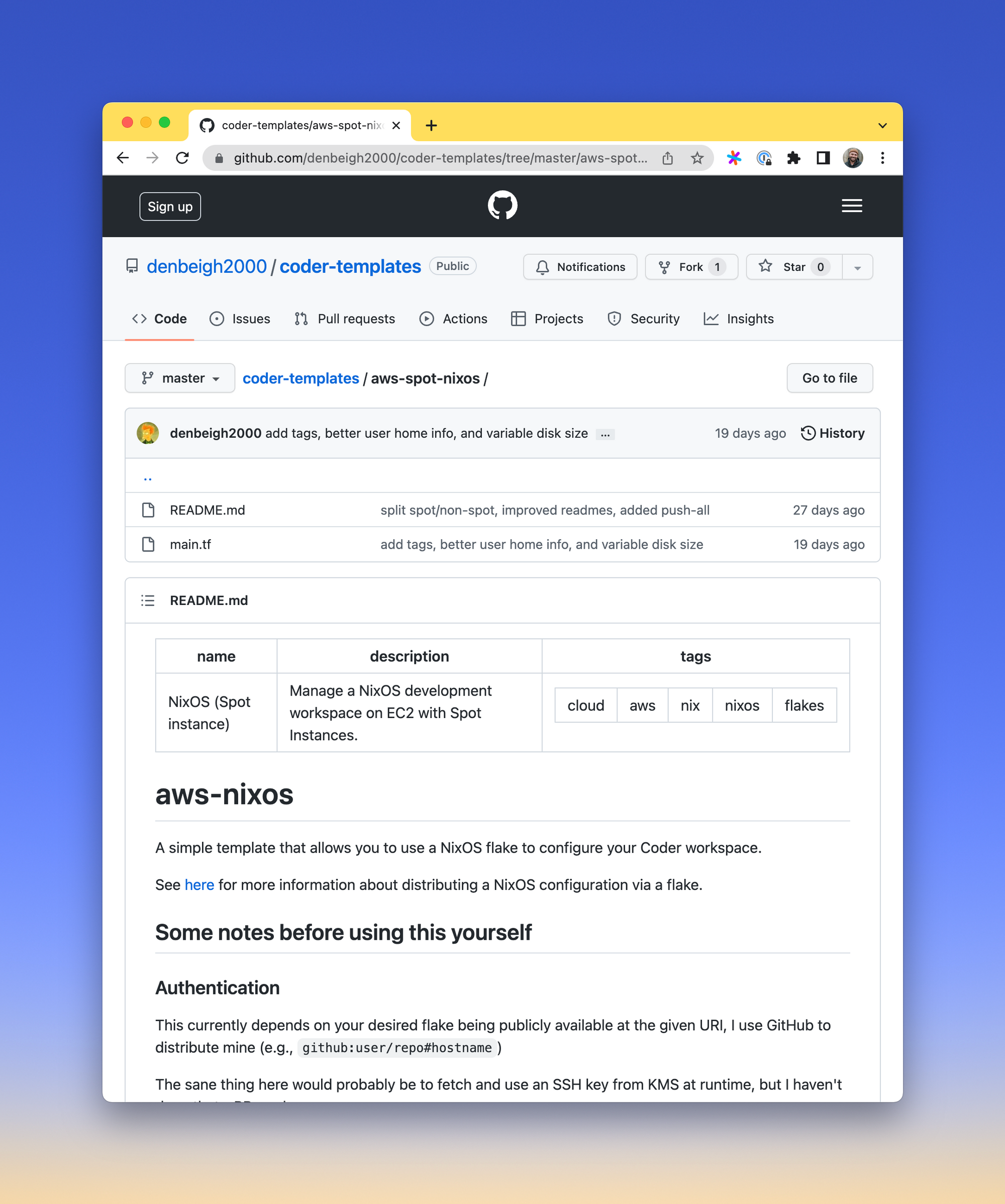 }and over at https://github.com/denbeigh2000/coder-templates/tree/master/aws-spot-nixos you'll find an example of a full-blown workspace template.