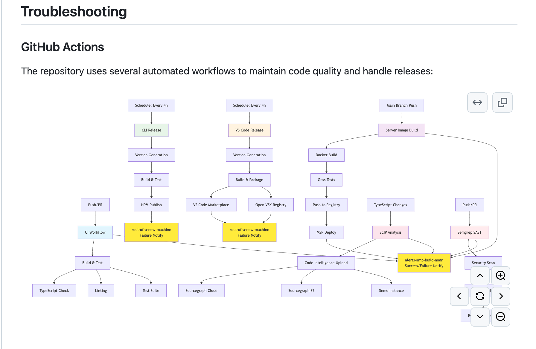 In the private Amp repository on GitHub, there is this mermaid diagram. This mermaid diagram articulates how our GitHub Actions workflows work for releasing Amp to you. It exists to make onboarding our staff into the project easier.