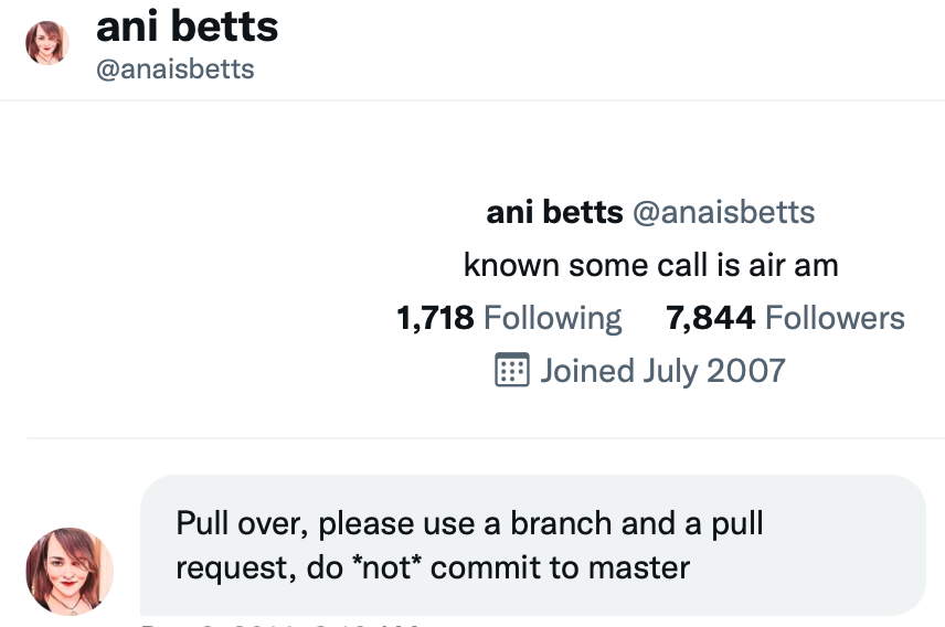 own it, learn, grow and adapt. I still vividly remember the moment in time where Ani 🚨🚔 arrested me in Slack 🚨🚔 for pushing to master. The lesson here was twofold: