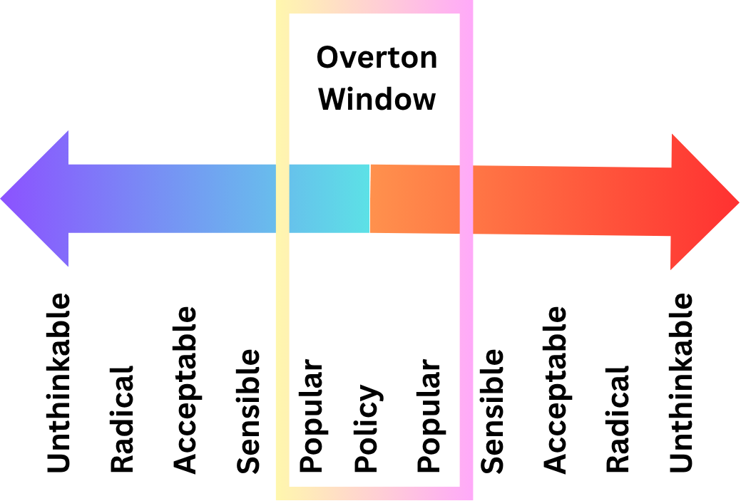 As innovators advocate, demonstrate value, or leverage external triggers (e.g., economic shifts), these ideas which were once unthinkable or radical gradually shift toward "acceptable" and "sensible" within the window.