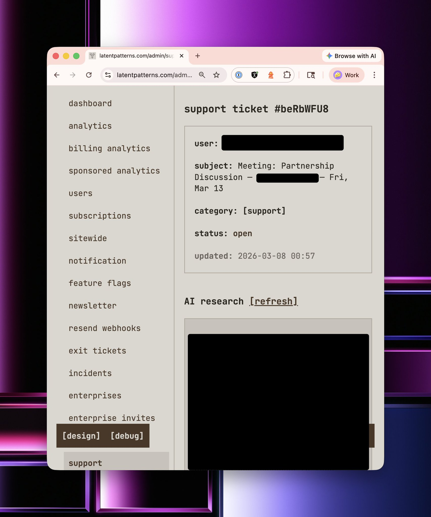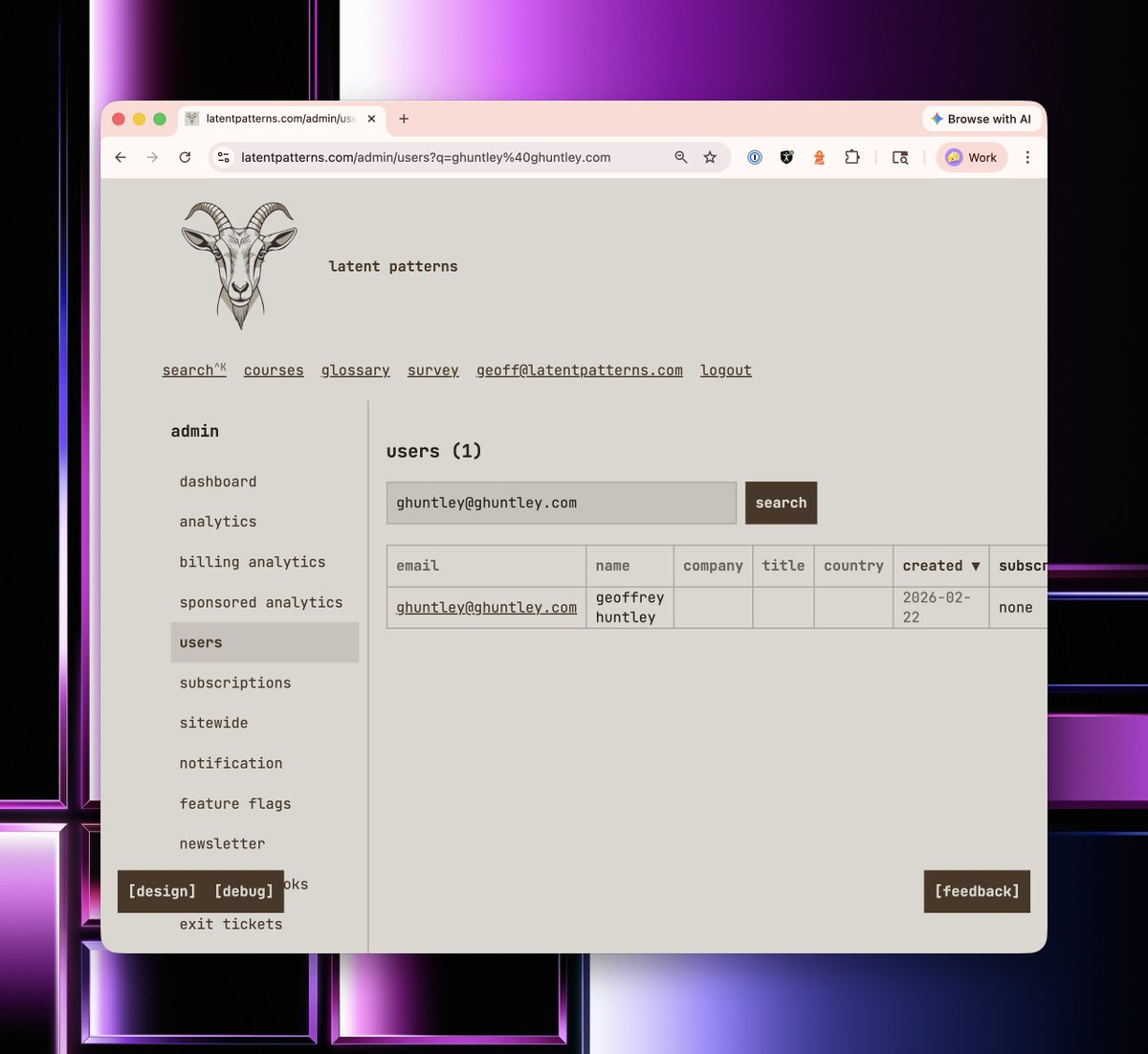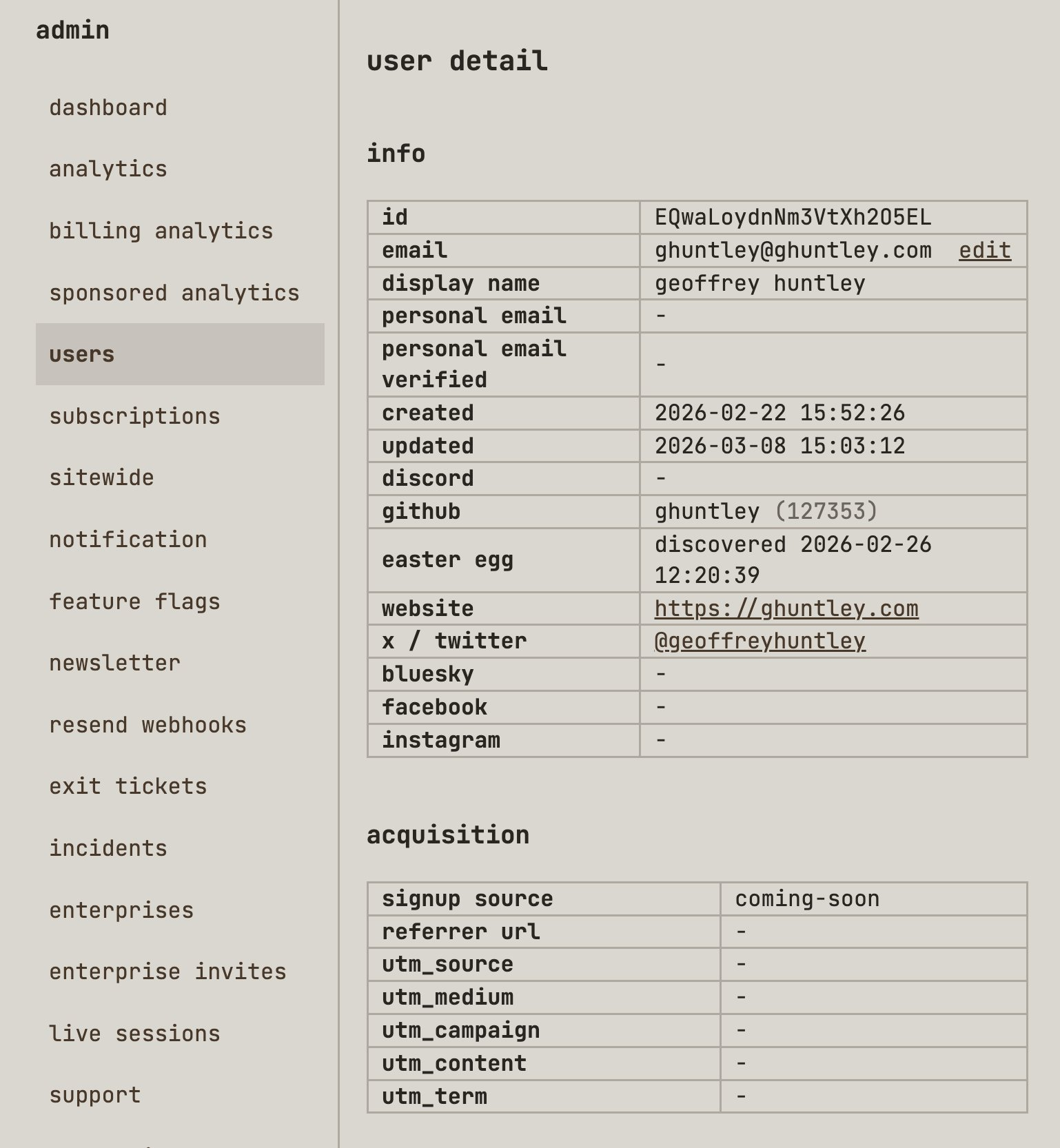 Seems pretty from vanilla, right? But do you notice the acquisition section? latentpatterns.com has first-party analytics built in and is horizontally and vertically integrated throughout the platform. To do this, I literally just ripped a fart into my coding harness and said,