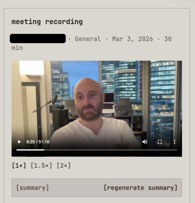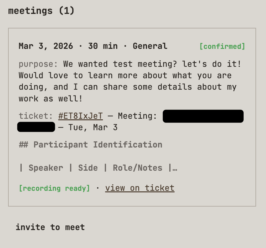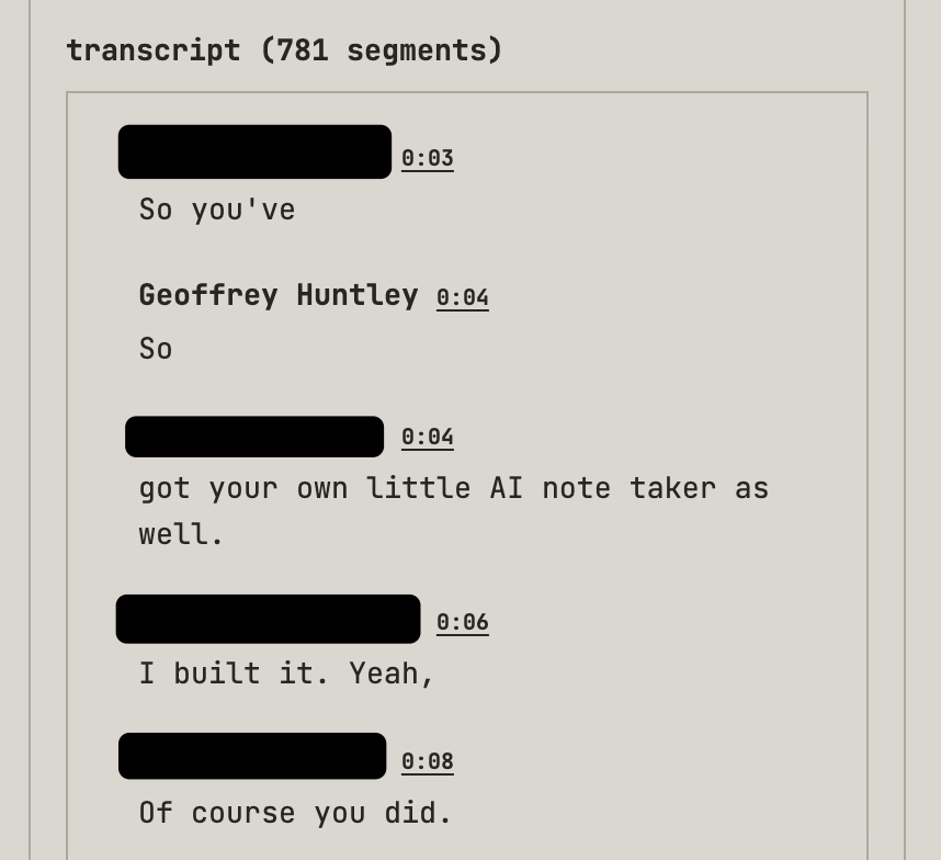 The calendar integration does exactly what you think it does, but with some twists. You see, I also ripped a fart into my coding harness and said that I want my own meeting transcription bot that automatically joins these meetings and asks for consent to take notes and record the meeting.
