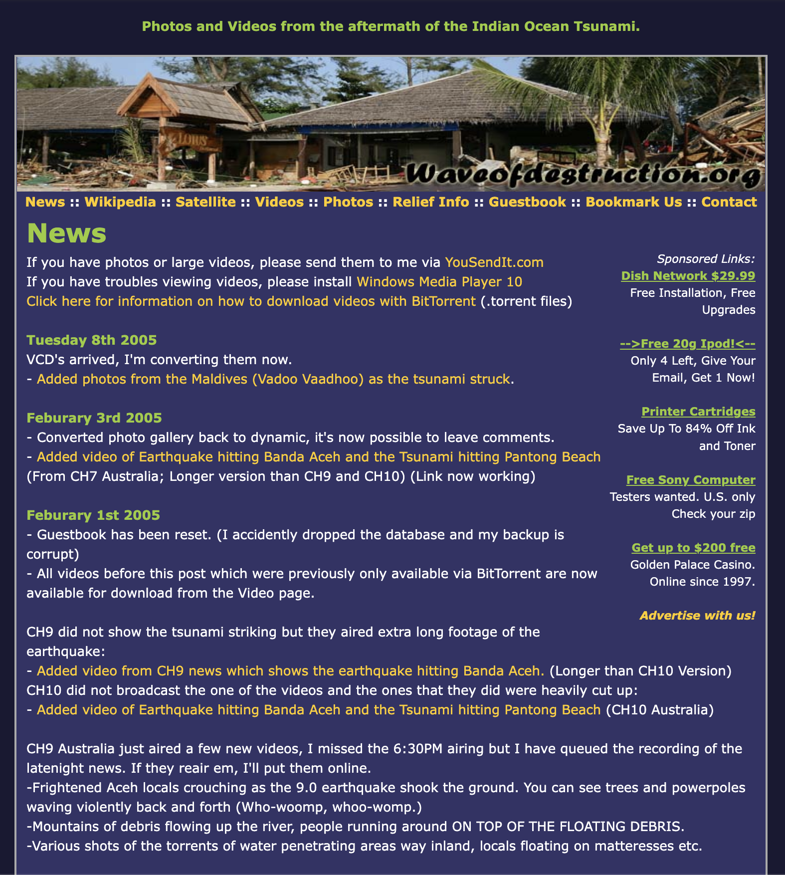 Waveofdestruction.org was created on December 28, 2004, to serve as a central location for all videos/photos related to the tsunami. Word spread quickly and much of the content was featured in newspapers and on network TV, current affairs and news programs worldwide.
